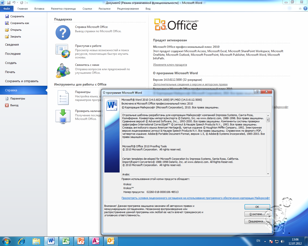Примечание: при ОЗУ менее 1 ГБ в Word не работает средство проверки правописания (отключено).