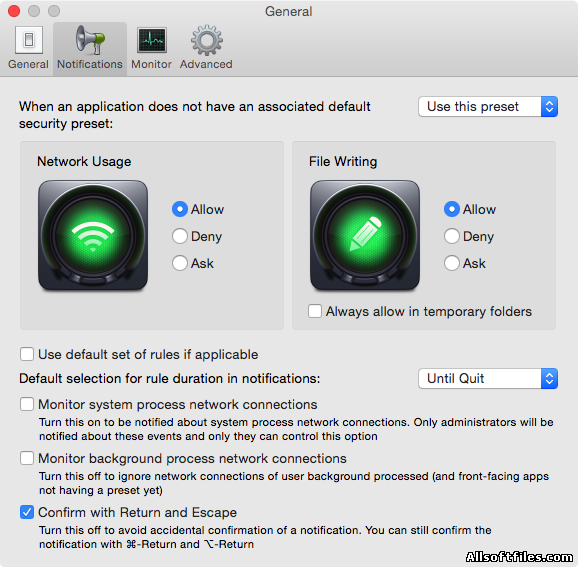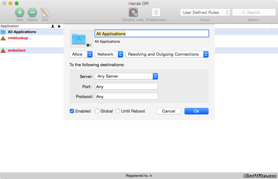 Этот функциональный и простой в использовании инструмент для платформы OS X может использоваться для мониторинга активности приложений, способных устанавливать подключение к Интернету. Благодаря Hands Off! пользователь сможет своевременно обнаружить признаки вредоносной или потенциально опасной деятельности, исключить вероятность утечки конфиденциальных данных и предотвратить проникновение вредоносных программ на персональный компьютер.