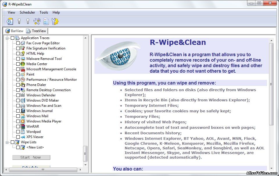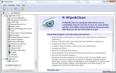 R-Wipe & Clean - программа для невосстановимого удаления данных с жесткого диска с широкими возможностями. Среди возможностей: очистка файла подкачки и файлов .dat (в т.ч. используемых системой), удаление записей в MFT и многое другое, что требуется для уничтожения следов деятельности за компьютером. Кроме очистки свободного места на диске (включая удаление кластеров, оставшихся от ранее удаленных файлов), R-Wipe & Clean также позволяет удалять выбранные файлы и папки путем нажатия на правую кнопку мыши (программа добавляет в контекстное меню Windows Explorer свои ярлыки "Delete and Wipe" и "Add to the Wipe List"), удаляет различные временные файлы, включая Temporary Internet Files, а также списки открывавшихся документов в различных приложениях и т.д. Поддерживается как система FAT, так и NTFS.