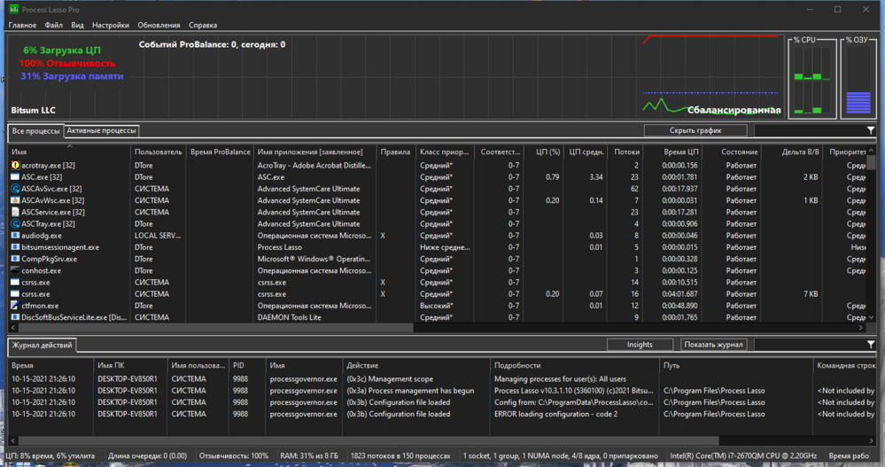 Технология ProBalance: Интеллектуально снижает приоритет фоновых процессов, которые чрезмерно нагружают CPU, предотвращая «зависания» интерфейса и рывки мыши.