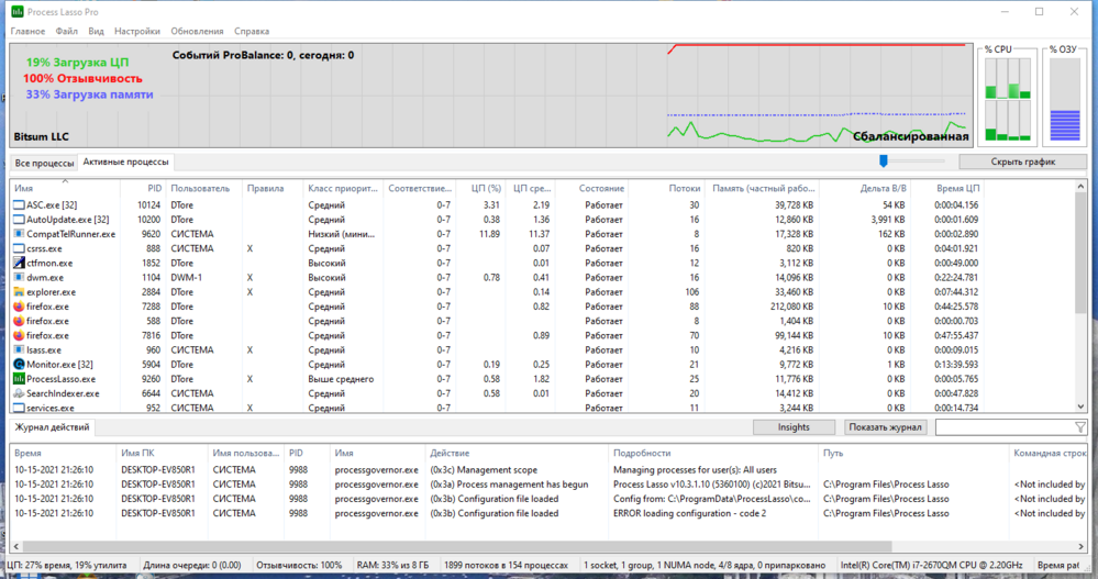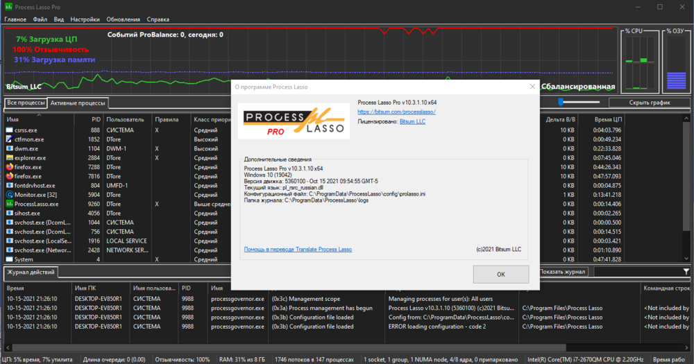 Process Lasso Pro 17.0.1.18 (актуальная версия на начало 2026 года) — это профессиональное решение для оптимизации производительности Windows в режиме реального времени. Программа использует алгоритмы автоматизации для управления приоритетами и распределением ресурсов процессора, обеспечивая отзывчивость системы даже при экстремальных нагрузках.